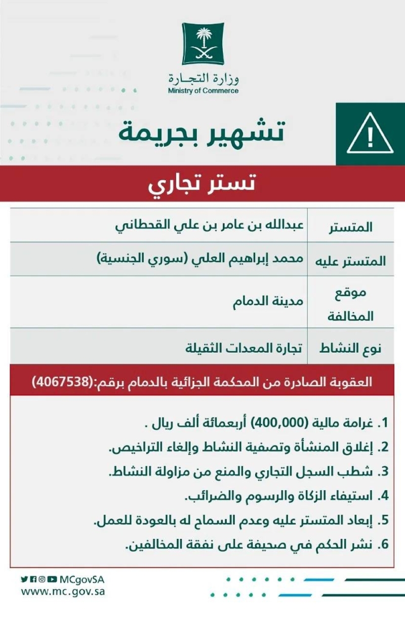 تشهير وزارة التجارة بمواطن سعودي ومقيم سوري الجنسية بعد صدور حكم قضائي بإدانتهما بارتكاب جريمة التستر في تجارة الآليات الثقيلة بالدمام. وتتعلق تفاصيل القضية بقضية تستر في منشأة مقاولات ، حيث تم توضيح أن المواطن فوض المقيم في أنشطة شراء معدات ثقيلة في المزادات وبيعها لمنشآت وأفراد. كما ثبت أن التستر تم على حسابه الخاص وتحويل الأموال إلى خارج المملكة ، بالإضافة إلى زيادة حجم تعاملاته المالية بما يثبت ارتكاب جريمة التستر. تم إرسالهم إلى النيابة العامة ثم إلى القضاء تطبيقاً لأحكام نظام مكافحة التستر.
